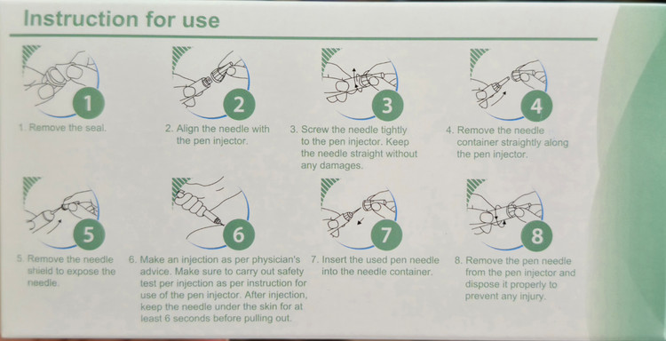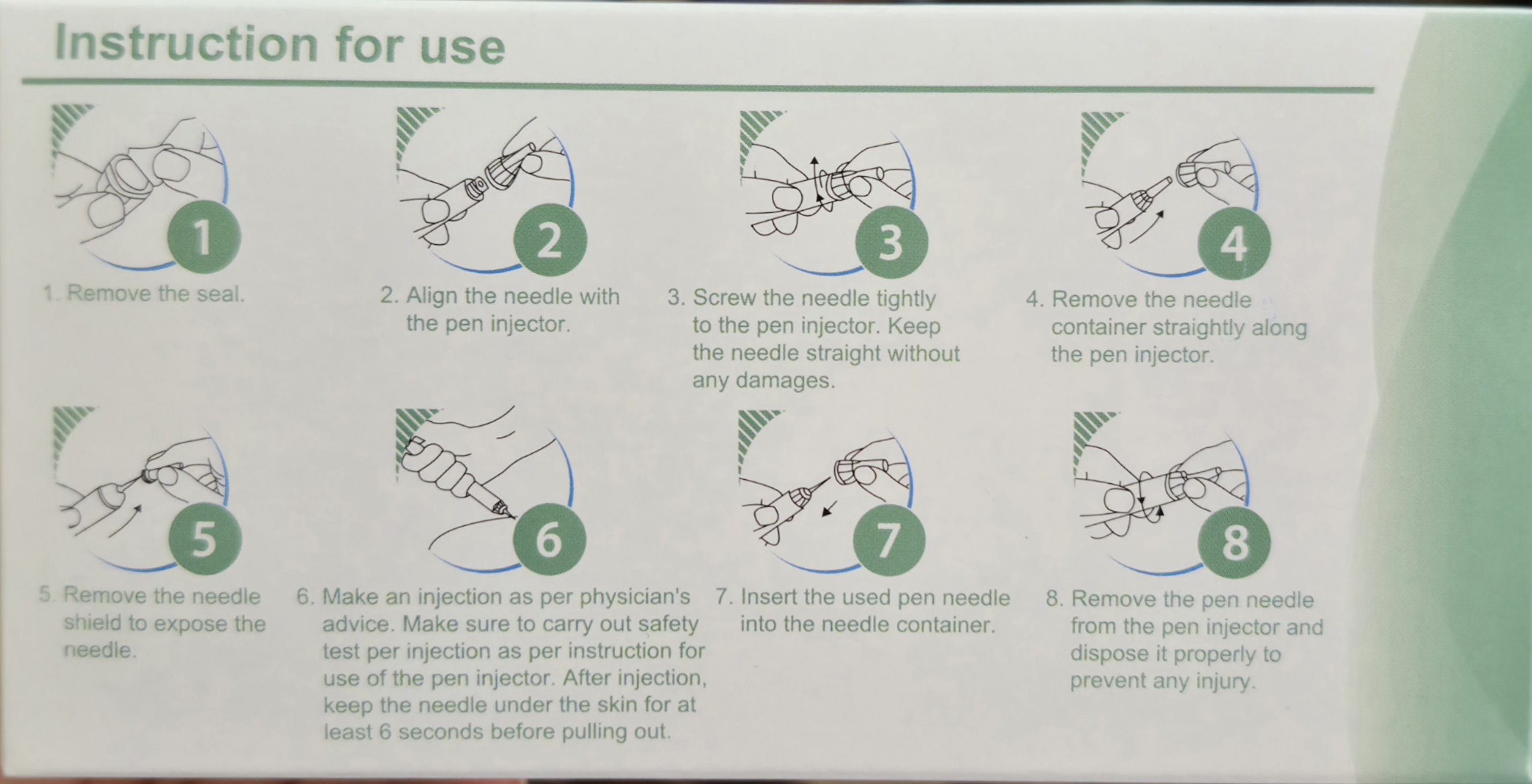 · استریل و ایمن (Non-Pyrogenic): هر سرسوزن بهصورت استریل و در بستهبندی انفرادی عرضه میشود. تولید در شرایط کنترلشده و روکش سیلیکونی علاوه بر کاهش درد، سطح بالایی از ایمنی و بهداشت را تضمین میکند. این محصول برای استفاده با قلمهای انسولین استاندارد طراحی شده و به دلیل ماهیت یکبار مصرف بودن، رعایت اصول بهداشتی و تعویض پس از هر تزریق ضروری است.