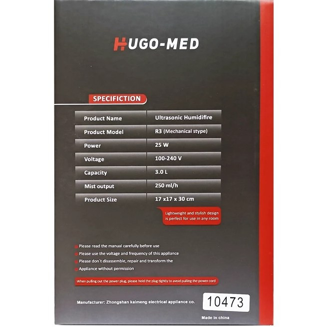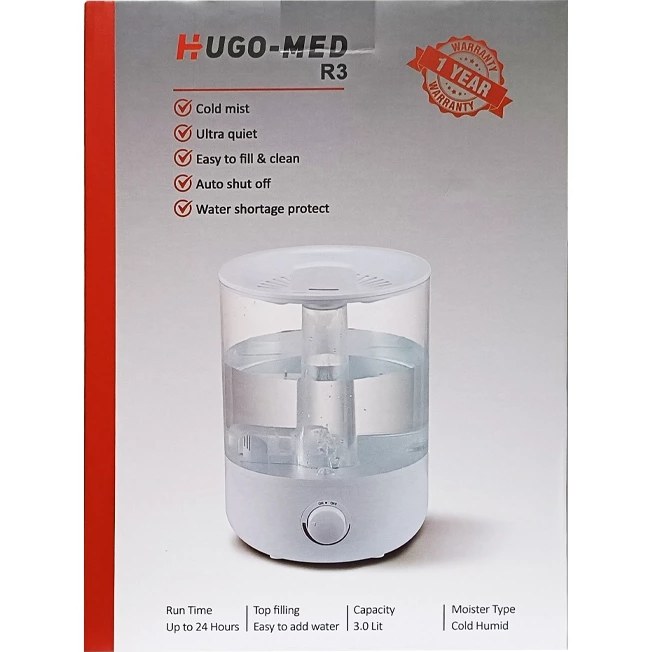بخور سرد هوگو مد مدل R3 با توان مصرفی 23 وات و خروجی بخار بسیار قوی برای کاربری خانگی طراحی شده و قابلیتهای کاربردی دارد. ظرفیت مخزن این دستگاه بخور 3.5 لیتر است و به راحتی بدون نیاز به باز کردن مخزن از بالا پر می شود. حداکثر فضای مناسب برای آن 60 متر مربع است. این میزان پوشش دهی برای دستگاه بخور خانگی کافی و برای یک اتاق بزرگ مناسب خواهد بود. گفتنی است میزان کارکرد مداوم این مدل با مخزن پر 8 ساعت است. همچنین قابلیت خاموشی خودکار پس از اتمام آب دارد و پس از تمام شدن آب خاموش خواهد شد. این مدل مجهز به کلید تنظیم بخار نیز است که کاربر میتواند بسته به نیاز خود از آن استفاده کند. همچنین میتوان میزان رطوبت محیط را با دستگاه تنظیم کرد. فوق العاده کم صدا بودن این دستگاه یکی از مزیتهای آن است .