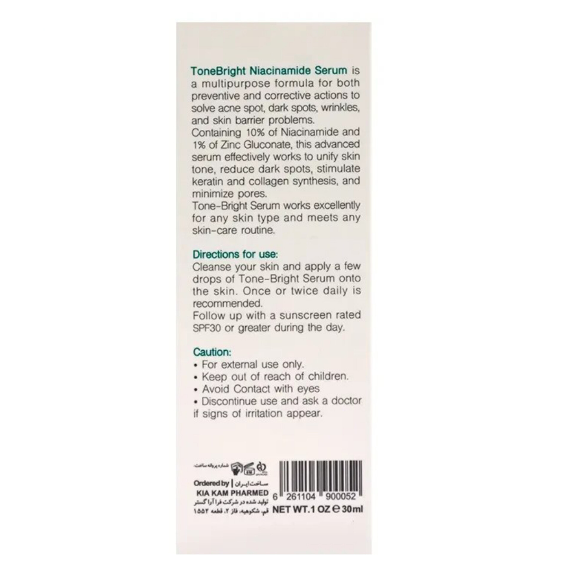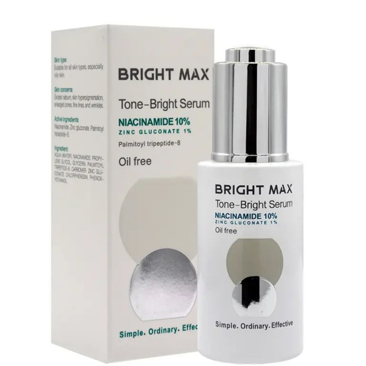 سرم نیاسینامید برایت مکس(bright max) جهت بهبود رنگ پوست، پیشگیری از پیری زودرس، متعادل سازی ترشحات چربی و رفع منافذ پوست طراحی شده است. ترکیبات موثر در سرم برایت مکس تیرگی های پوست را کاهش میدهد و با مهار پخش شدن ملانین در پوست، از ایجاد لک جلوگیری میکند و خطوط ریز و چین و چروک پوست صورت را کاهش می دهد.