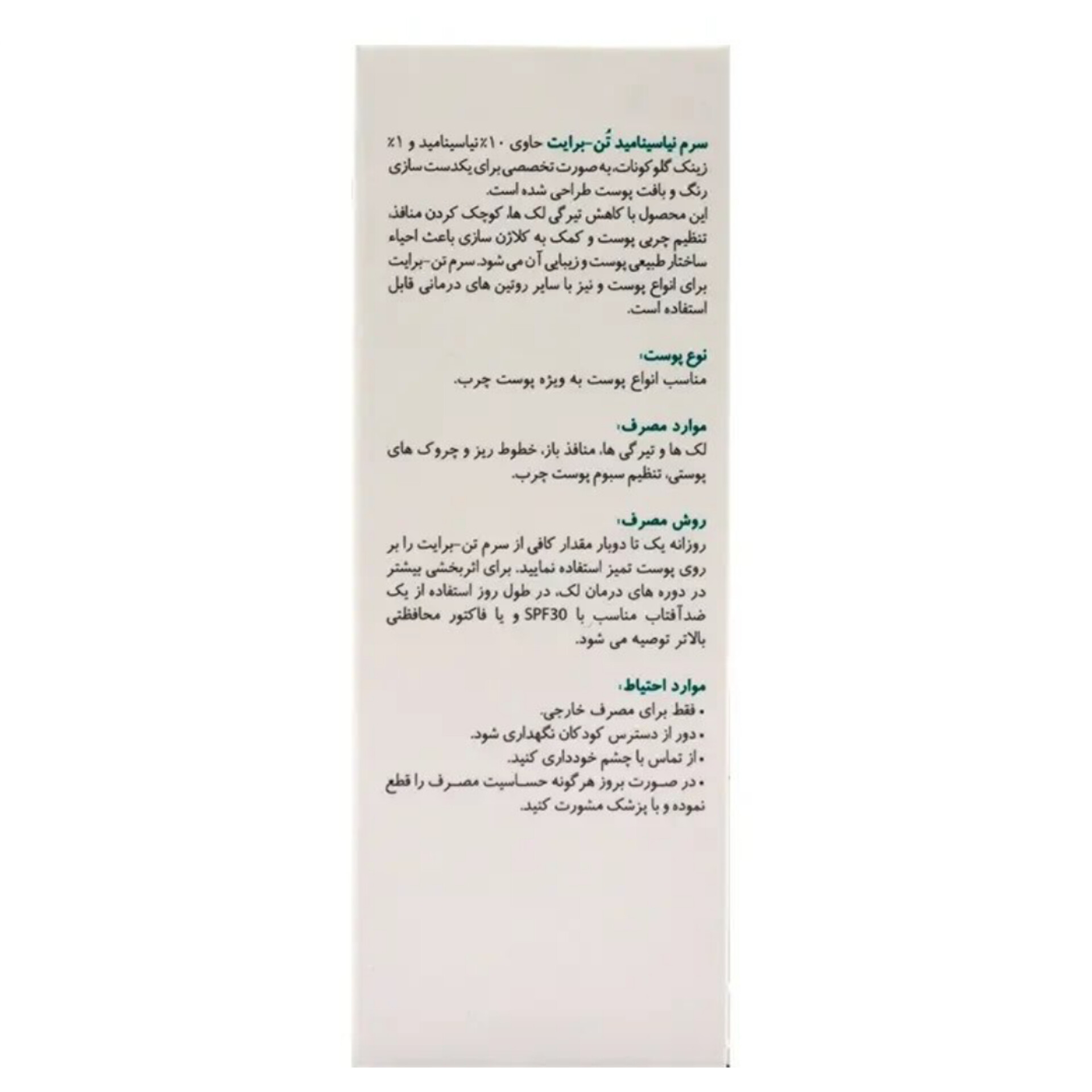 سرم تن برایت نیاسینامید برای جای جوش استفاده می شود و با خواص آنتی باکتریال خود برای درمان آکنه مفید است. هر دو ماده اصلی سرم نیاسینامید برایت مکس، نیاسینامید و زینک گلوکونات موجب کاهش ترشح چربی پوست شده و منافذ باز پوست را کوچک می کنند.