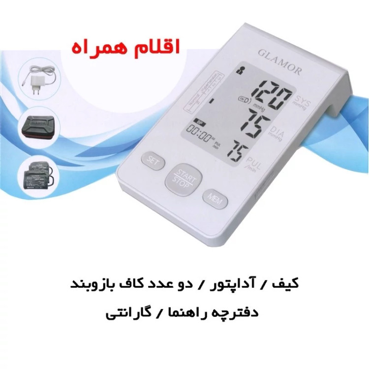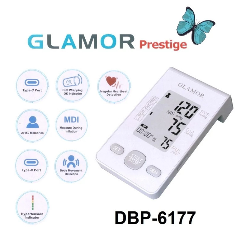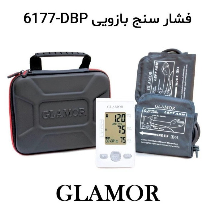 دستگاه فشارسنج بازویی گلامور Glamor مدل DBP-6177 شامل یک کیف محکم، یک عدد کاف ساده کوچک ( مناسب برای دور بازوی 22 الی 36 سانتی متر)، یک عدد کاف ساده بزرگ (مناسب برای دور بازوی 22 الی 42 سانتی متر)، آداپتور، دستگاه و دفترچه راهنما است. این دستگاه قادر است هم با برق و هم با باتری کار کند؛ باطری درون پکیج موجود نیست. از قابلیتهای این دستگاه میتوان به اندازهگیری دقیق فشار خون به صورت 180 ضربه در دقیقه و میزان فشار خون را از 30 تا 250 میلیمتر جیوه نشان میدهد. همچنین این فشارسنج دارای حافظه است و میتواند برای دوکاربر مجزا تا 150 بار میزان حافظه بیمار را در خود ذخیره کند.فشارسنجهای دیجیتال به دلیل دقت بالاتر و سرعت بیشتر در اندازهگیری فشار خون، انتخاب بسیاری از افراد میشوند. این دستگاه مجهز به تکنولوژی MDI می باشد که در حین اندازه گیری با شنیدن همزمان ضربان فشار خون را اندازه گیری میکند که در نتیجه دقت بیشتر و همچنین از فشار بیش از حد به بازو کاسته می شود