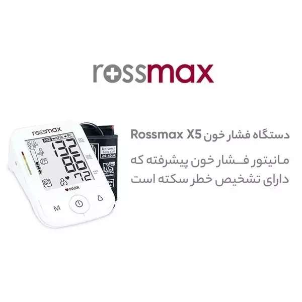 X5 "PARR" Automatic Blood Pressure Monitor از محصولات برند مشهور رزمکس (Rossmax) هست که ساخت کشور سوئیس بوده و مطابق با استانداردهای معتبر بینالمللی طراحی شده. بهخصوص برای کاربرد خانگی، کلینیکی و مراقبتهای قلبی.